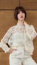 A delicate lace top defined by its intricate texture and softly structured silhouette. Designed with a refined high neckline and gentle volume, offering a balance between elegance and modern ease.
