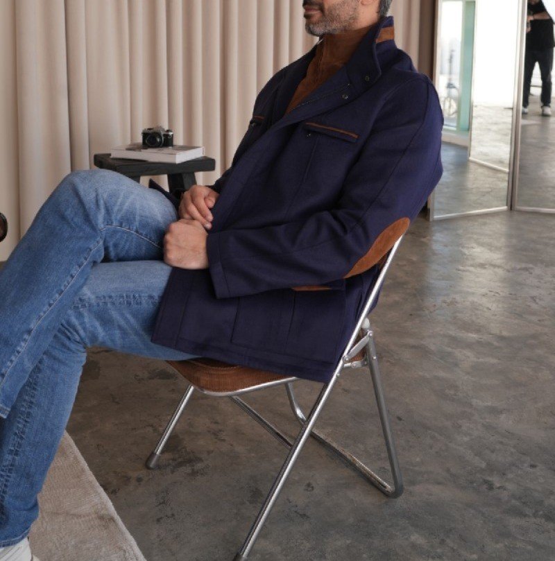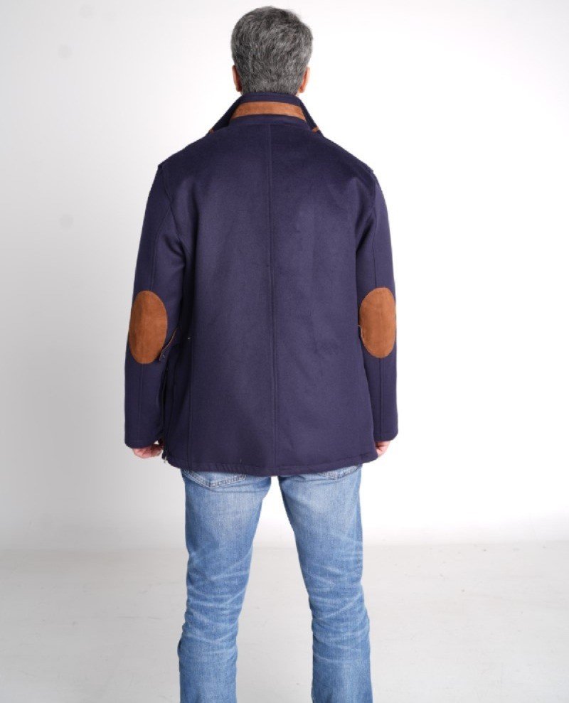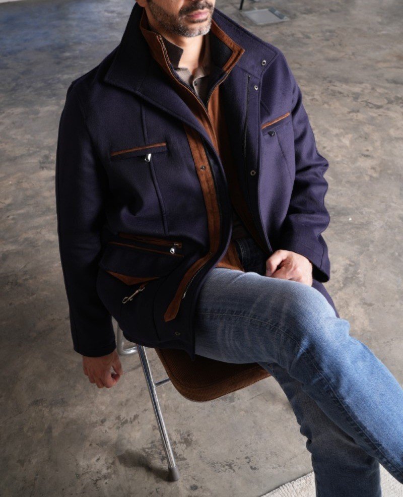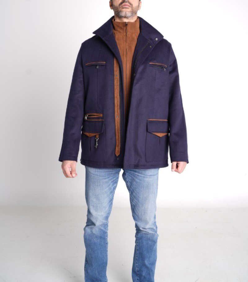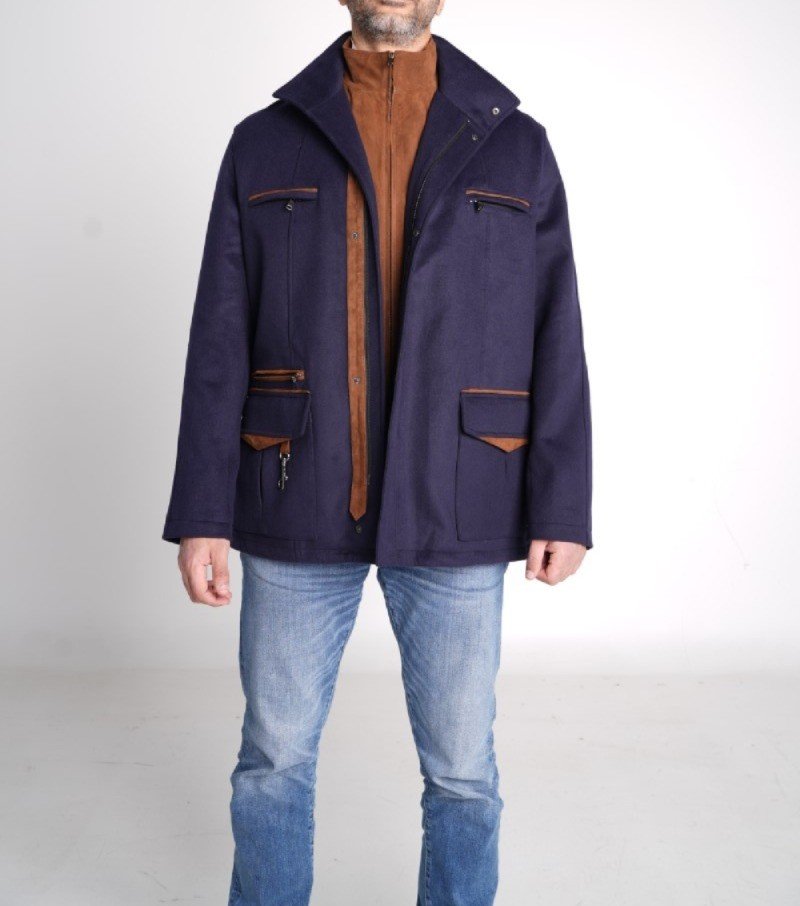 A structured winter layer crafted from a cashmere-rich shell, elevated with a suede inner vest and warm cognac suede accents that add quiet depth and refinement.