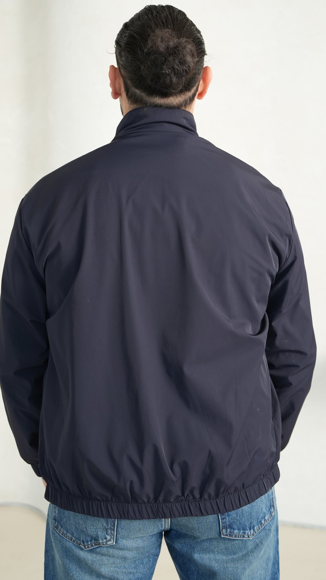 The reversible bomber in navy — waterproof on one face, a deep cashmere-cotton blue on the other
