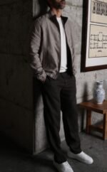 A lightweight summer bomber cut from breathable linen with a contrasting dark grey cotton interior, offering two refined silhouettes in one understated design.