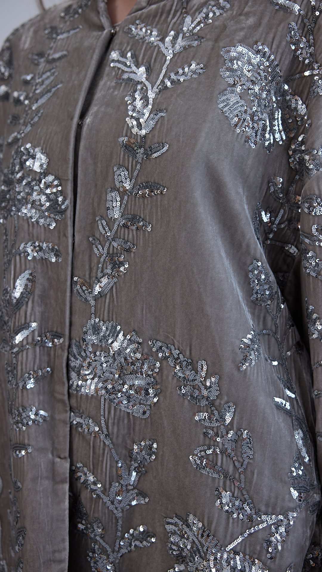 Silk-blend velvet with delicate floral embroidery.