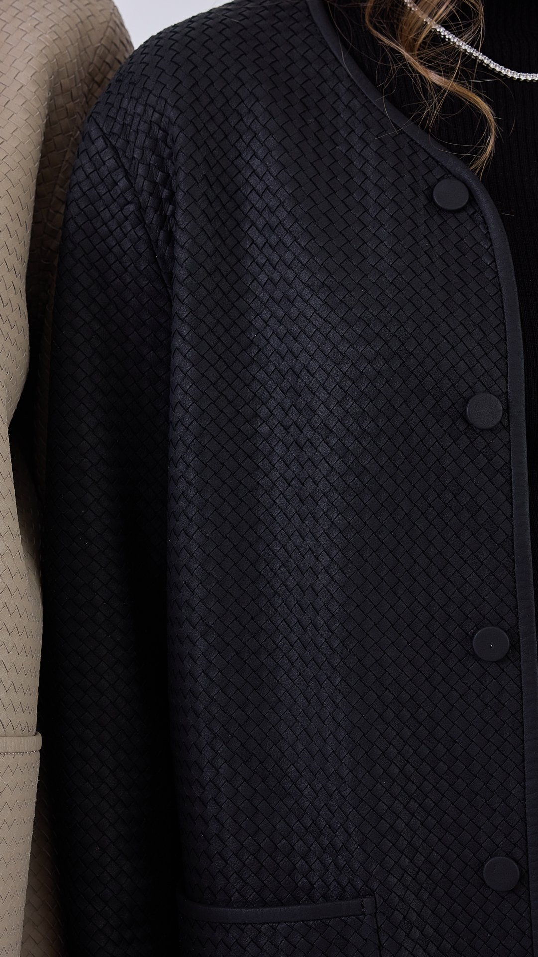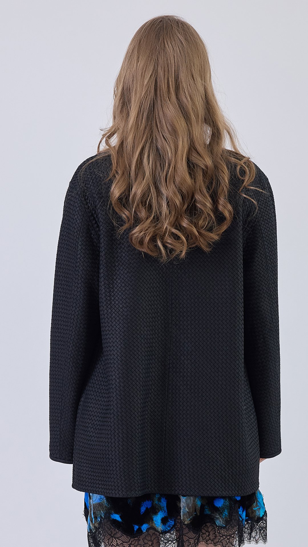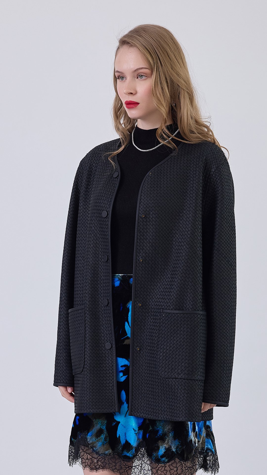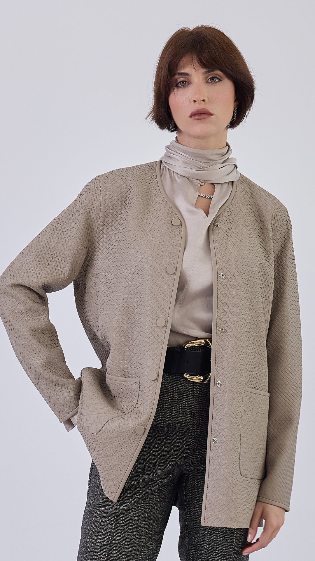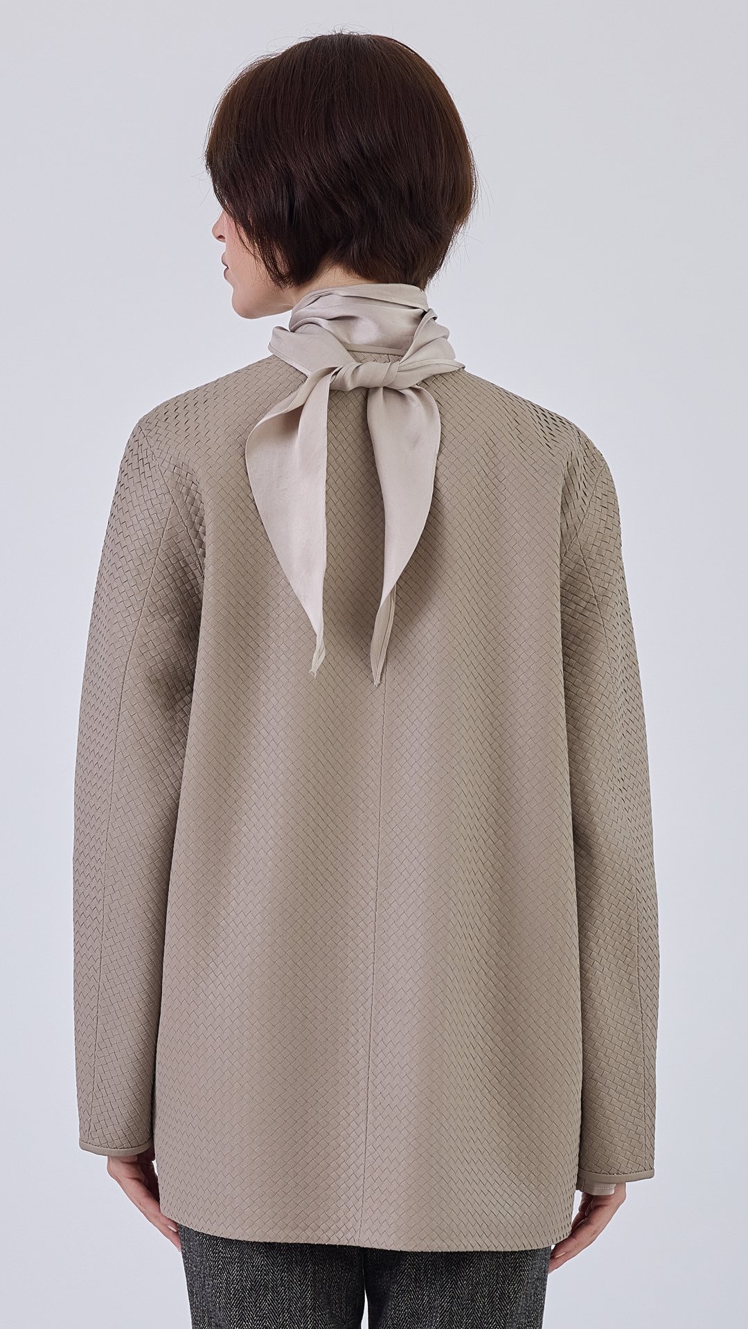 Softly structured coat crafted from natural lambskin leather, defined by a refined woven texture and a clean, modern silhouette.
