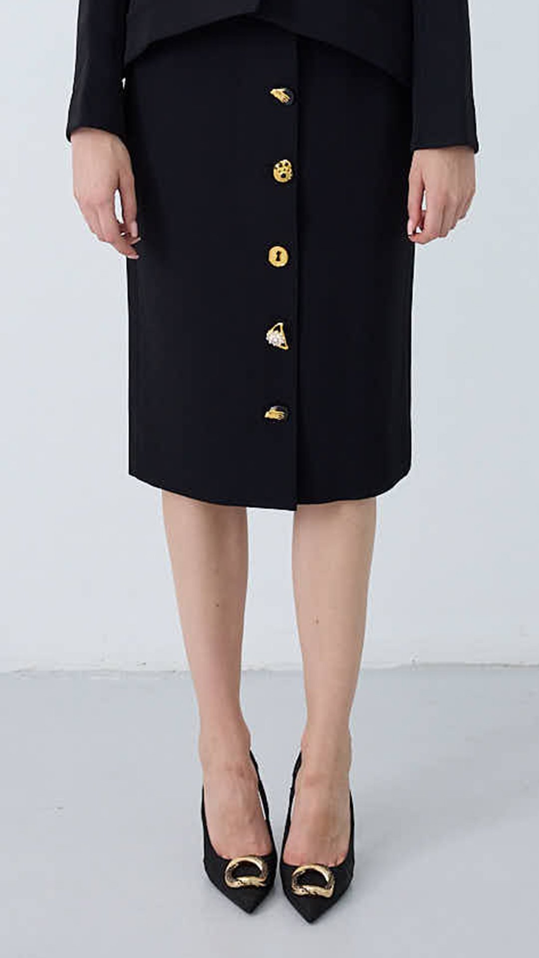 Clean, elongated silhouette with a front button line in signature gold-tone detailing.