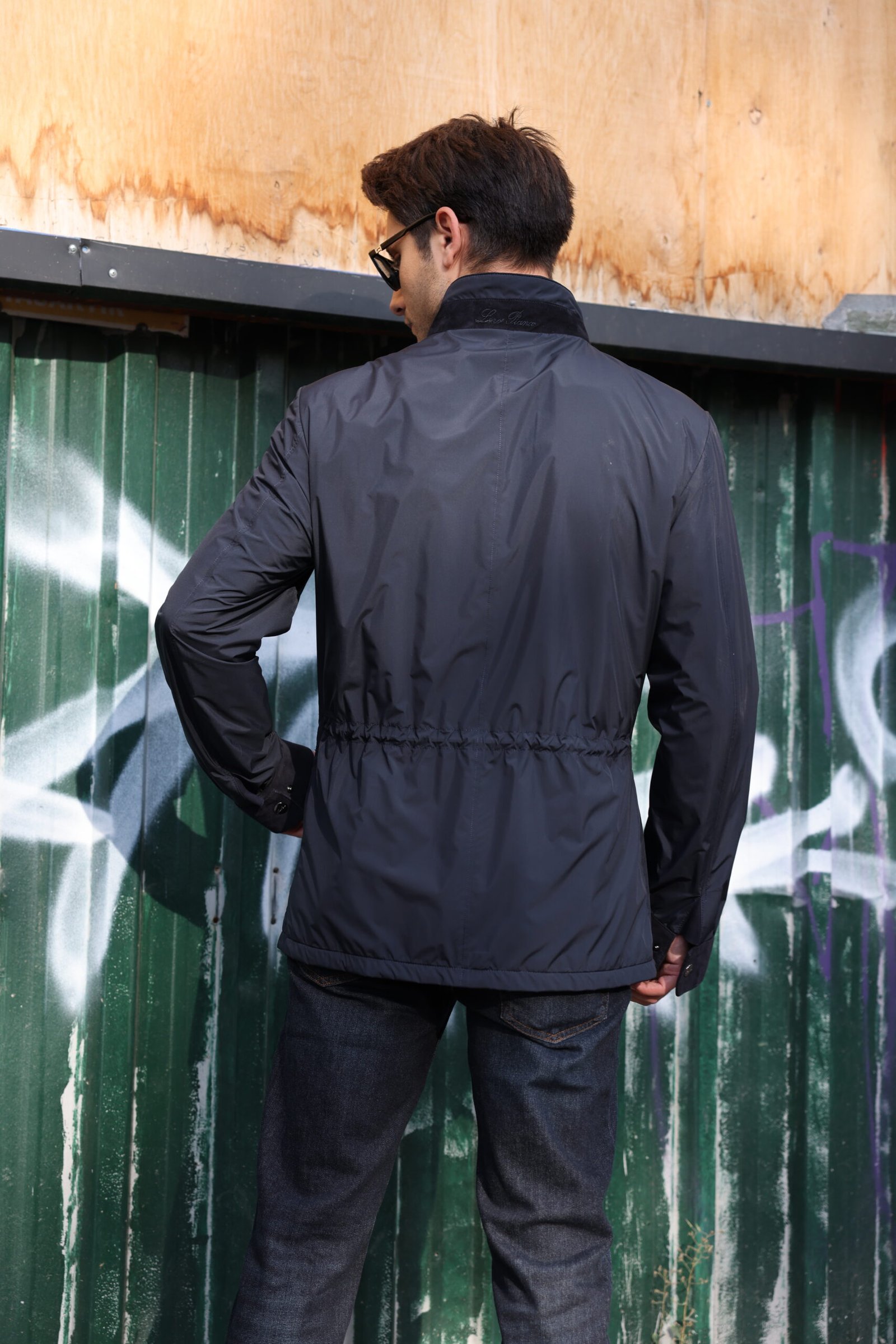 This lightweight jacket made with LOROPIANA material features a sleek design in a sophisticated navy blue color.